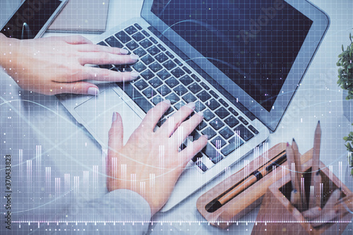 Multi exposure of woman hands typing on computer and forex chart hologram drawing. Stock market analysis concept.