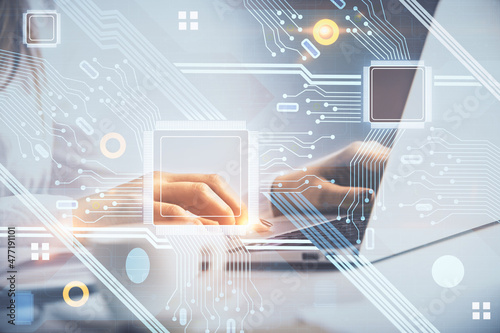Multi exposure of woman hands working on computer and data theme hologram drawing. Tech concept.