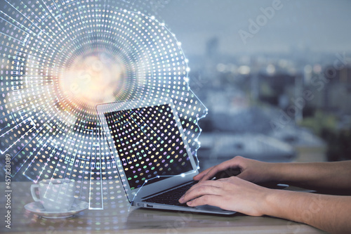 Multi exposure of woman hands working on computer and human brain hologram drawing. Ai tech concept.