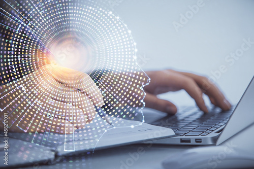 Multi exposure of woman hands working on computer and human brain hologram drawing. Ai tech concept.