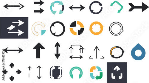 "Multicolor Circular Motion and Directional Arrow Icon Set in Grid Layout"