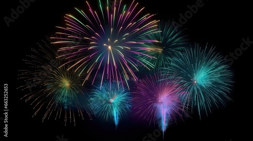 Multicolor fireworks explosion in night sky. Black background.