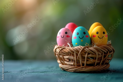 Multicolored funny painted Easter eggs with cheerful faces in wicker basket on natural blurred background with copy space and bokeh effect, happy Easter greeting card