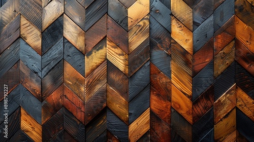 Multicolored herringbone wood texture with rich tones. Geometric and detailed wooden background. Suitable for flooring, decor, and interior design projects. Unique wood design concept.