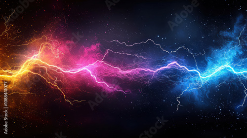 Multicolored luminous sparks forming jagged lightning in dark sky