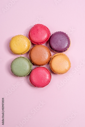 Multicolored macarons isolated on pink background. French dessert, macarons on the background, delicious dessert