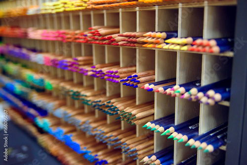 Multicolored pencils in art store in wooden cells closeup, selective focus. Artspace, workshop, creativity concept. Modern art.