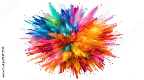 Multicolored powder bursts in mid-air, with vivid particles spreading dynamically on a clean white backdrop.