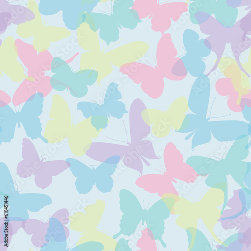 Multicolored silhouettes of butterflies on a light background, seamless vector pattern