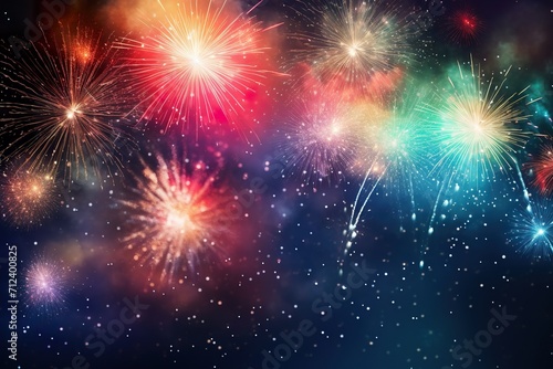 Multi-colors Fireworks and bokeh in New Year eve and copy space. Abstract background holiday