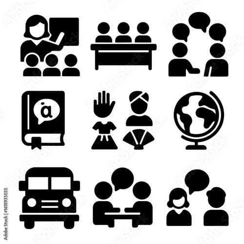 Multicultural Classroom Icons. Solid, filled icon set of Multicultural classroom: teacher, diverse students, blackboard, classroom