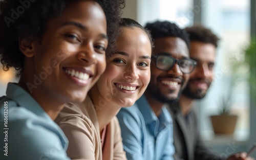 Multiethnic joyful business people looking at camera inside corporate office for a group photo while working together on sustainable innovation project - Goal achievement, Generative AI. High quality