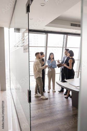 Multiethnic team of serious managers discussing teamwork in modern office meeting workspace, standing in collaboration room behind glass wall, talking, brainstorming. Vertical shot