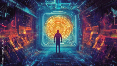 Multi-layered business figure divided between physical and digital realms, secure blockchain chambers protecting core financial data, AI security protocols visualized as flowing energy shields,