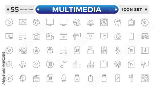 Multimedia outline Icons set. Vector illustration in thin line style of modern digital technology icons: photo, video, music, audiovisual equipment, and more. Editable stroke outline icon.