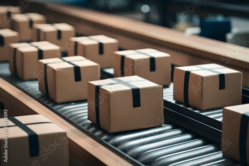 Multiple cardboard box packages move along conveyor belt, close up