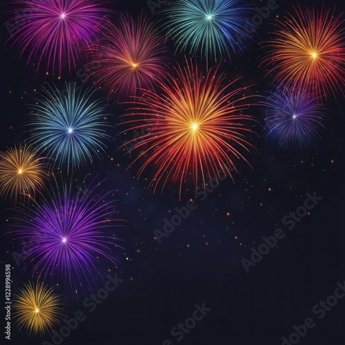 Multiple colorful fireworks bursts illuminate the night sky in a vibrant display, AI generated