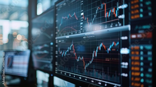Multiple computer screens displaying financial market data and stock charts in a modern trading office with a blurred background.