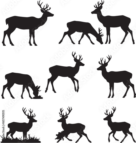 Multiple deer silhouettes in various poses stag black
