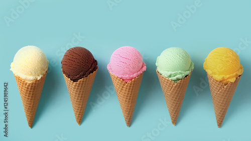 Multiple flavour ice cream with cone isolated blue, 300dpi, 3d illustration
