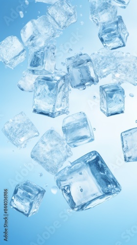 Multiple Ice Cubes Falling Through Air Against Blue Background