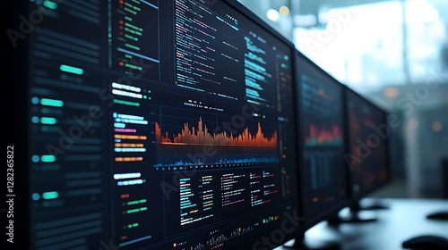 Multiple Monitors Displaying Data Analysis Code and Graphs