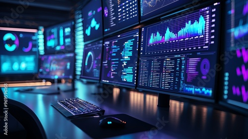 Multiple monitors displaying stock charts and financial data on a trading desk, representing investment tools and market analysis.