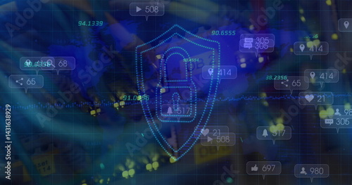 Multiple numbers over security shield and padlock icon against close up of a computer server
