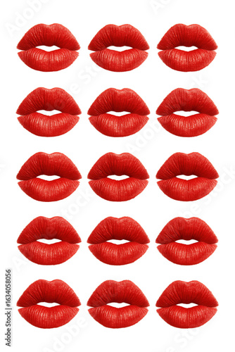 Multiple red lips printed in a grid pattern creating a bold and stylish visual design on transparent background.