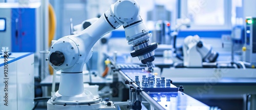 Multiple robotic arms in manufacturing facility Automated production line High-tech machinery Blue tones Clean environment Factory interior