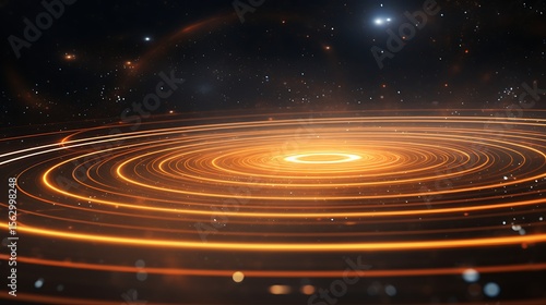 Multiple rotating data rings in vibrant orange, floating in concentric alignment with fading binary trails.