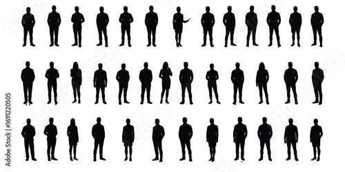 Multiple Rows of Human Silhouettes Standing in Various Poses on White Keywords: silhouette, people