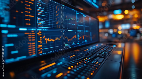 Multiple screens showing financial charts and data analysis in a high-tech environment, symbolizing chaos, modern technology, and the fast-paced nature of financial markets, with empty space for capti