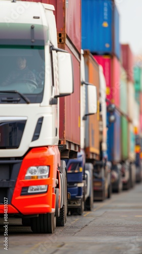 Multiple trucks lined up for loading at port, organized transport, copy space for text, focus on objects, deep depth of field.