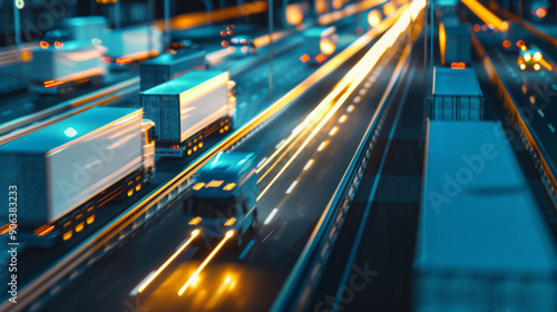Multiple trucks speed along a highway at night, their lights streaking through the frame, capturing the dynamic flow of late-night freight transport.