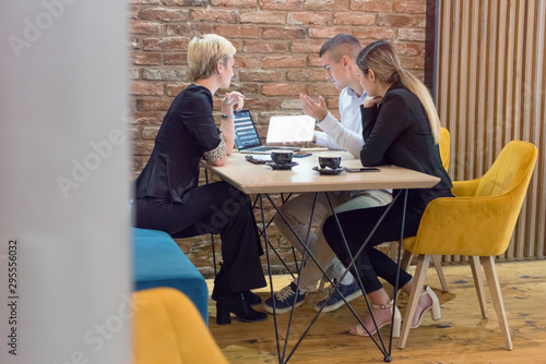 Multiracial business people working connected with technological devices at the bar. Group of three young creative coworkers working with new startup project.
