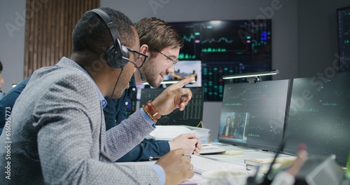 Multiracial financial analysts talk and monitor real-time stocks on computer. Businessmen work in bank office. Big digital screen with exchange market charts. Cryptocurrency trading and analytics.