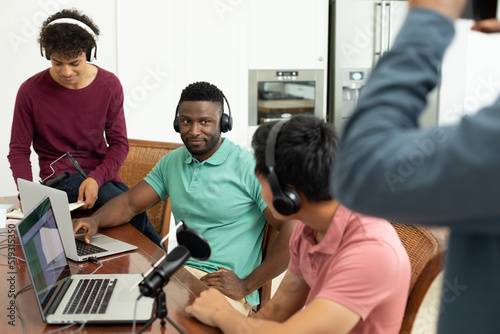 Multiracial male podcasters interviewing and recording podcast in creative office, copy space