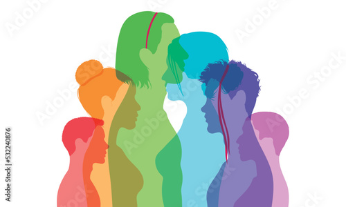 Multiracial people in a multicultural society. Abstract cartoon head face of a diverse group of people in profile. Friendship between diverse people of different ethnicities.