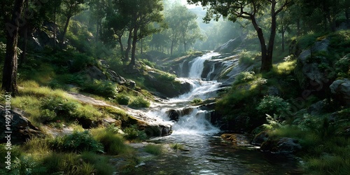Multi-tiered waterfall cascades through a sun-drenched green forest, with golden sunlight filtering through the canopy. The photorealistic image captures nature’s serene beauty with lush
