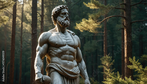 Muscular statue of a mythological figure standing in a dense forest during golden hour
