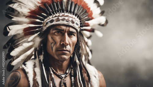Muscular young American Indian tribal chief in traditional dress, white background.