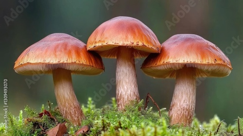 Mushroom close-up in a serene moss-covered forest, capturing fine details of Boletus fungi.