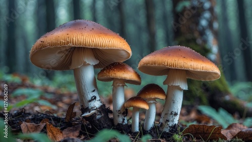 Mushroom cluster in forest environment showcasing various sizes and colors with blurred background and fallen leaves on the ground