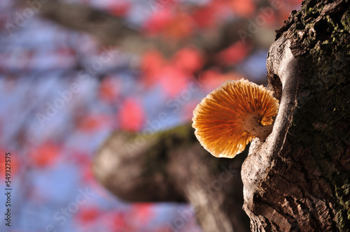 Mushroom inside a hole of a cuted tree branch, background with autumn colors
