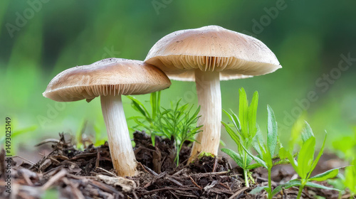 Mushrooms growing natural environment, showcasing their delicate structure and earthy tones, evoke sense of tranquility