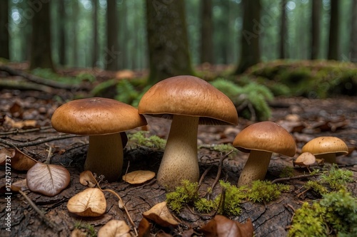 Mushrooms growing on forest floor surrounded by leaves and moss in a tranquil woodland setting