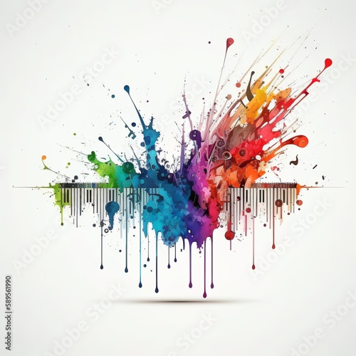 Music stave colorful splash illustration on white background, horizontal banner with copy space trickles down explosion keys music musicians it shines together with a signature creative Generative AI