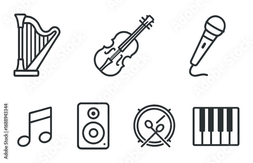 Musical instrument icons on dark background: harp, violin, microphone, notes, speaker, drums, piano