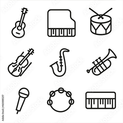 Musical Instrument Icons. Outline icon set of musical instruments: guitar, piano, drum, violin, saxophone, trumpet, microphone,